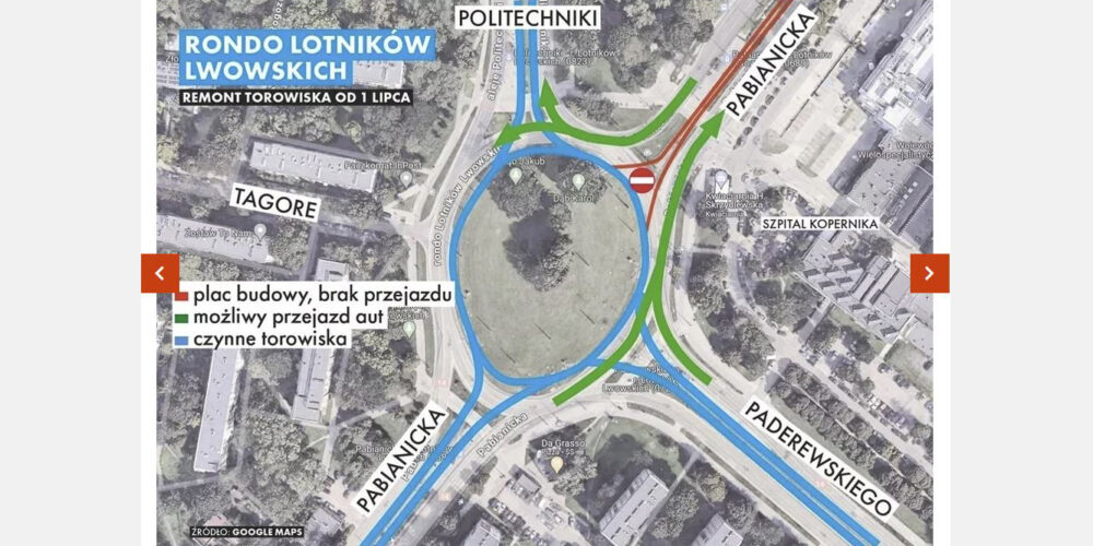 Nie będzie można pojechać samochodem z ul. Paderewskiego w al. Politechniki czy w stronę al. Jana Pawła II. Cały ruch z jezdni będzie kierowany w ul. Pabianicką w stronę pl. Niepodległości.
