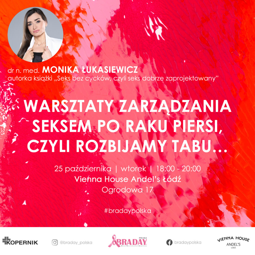 Zagrożenie życia związane z diagnozą nowotworu piersi sprawia, że uważa się, ze seksualność nie jest kluczową sprawą w momencie postawienia diagnozy. Ponad 90% kobiet z tym rozpoznaniem cierpi z powodu obniżenia jakości życia i problemów seksualnych. Podczas warsztatów z zarządzania seksem po raku piersi dr n. med. Monika Łukasiewicz będzie mówiła o pożądaniu, podnieceniu i orgazmie. Porozmawiamy o tym, jak sprawić żeby życie seksualne po raku było po prostu wystarczająco dobre.