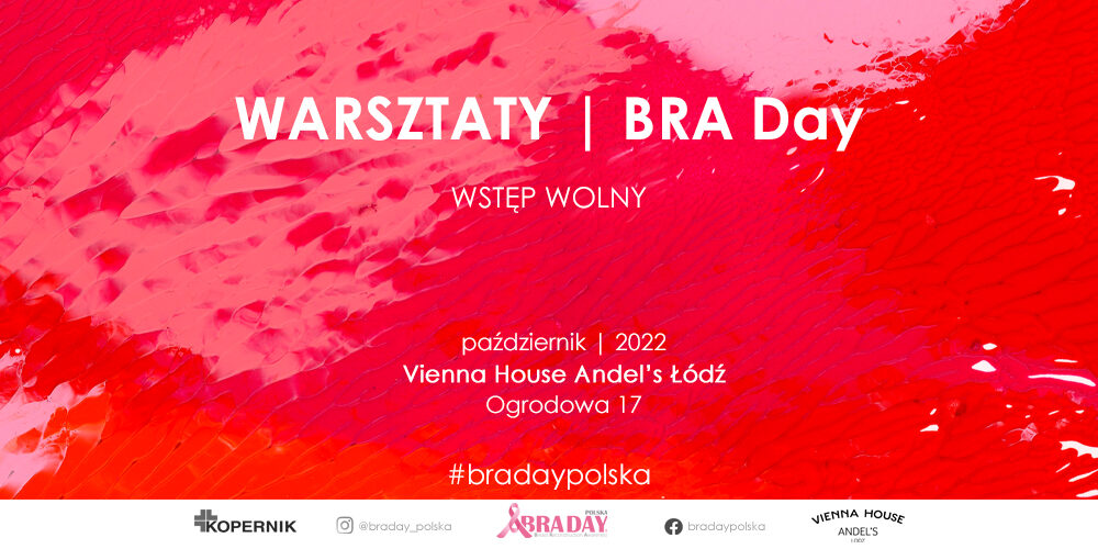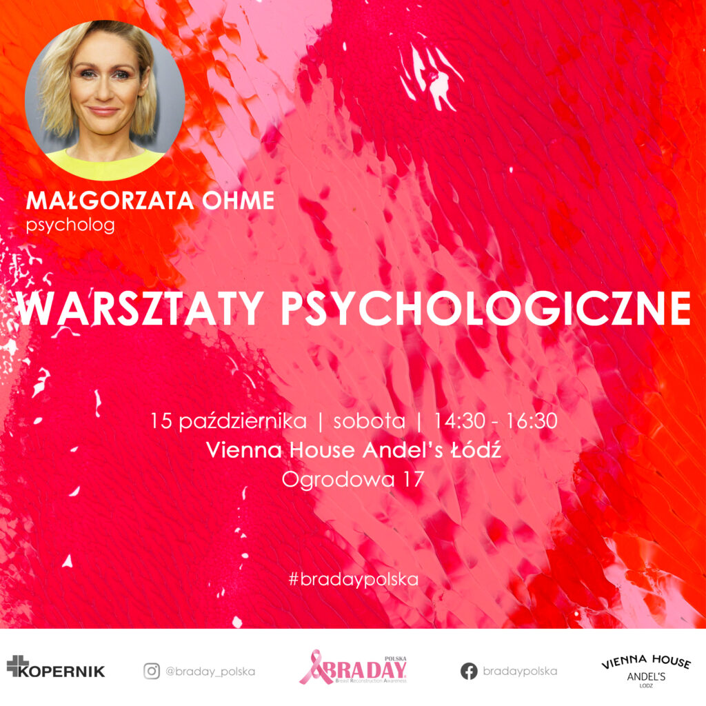 15.10 o godz. 14:30 w hotelu Vienna House Andel’s Lodz (ul. Ogrodowa 17) odbyły się kolejne warsztaty w ramach wydarzenia BRA Day Polska. Tym razem było to spotkanie z psychologiem Małgorzatą Ohme – psychologiem z zawodu i prywatnie, która leczy dusze wszystkich swoich przyjaciółek. Mama Klary i Jurka, wielbicielka psów, dobrej kawy, czerwonego wina i kobiet. Chciałaby mieć kota, ale nie może. Wzrusza ją miłość starszych ludzi. Uwielbia gotować, piec ciasta i patrzeć, jak Klara jeździ konno. Uważa, że lęki są po to, by je pokonywać.