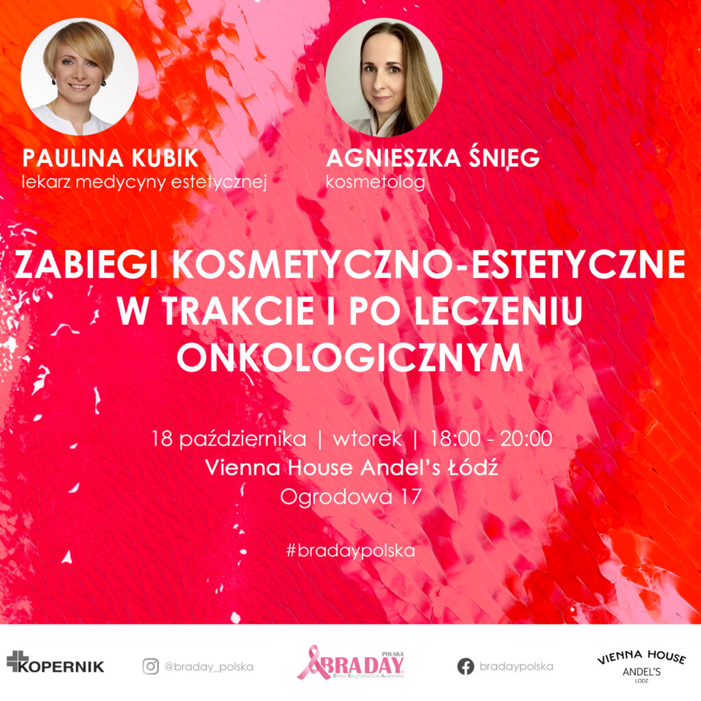 Mimo leczenia onkologicznego wiele pacjentek ma ochotę lub potrzebę poddać się zabiegom kosmetyczno-estetycznym. Pacjentki onkologiczne mają prawo czuć się piękne i zadbane. A na pytania dotyczące tego, na jakie zabiegi mogą sobie pozwolić kobiety w trakcie i po leczeniu onkologicznym, odpowiedzą ekspertki – Paulina Kubik i Agnieszka Śnieg. Zapraszamy na spotkanie w ramach BRA Day Polska, które odbędzie się we wtorek 18 października o godz. 18:00 w hotelu Vienna House Andel’s Lodz (ul. Ogrodowa 17) Vienna House. Wstęp wolny.