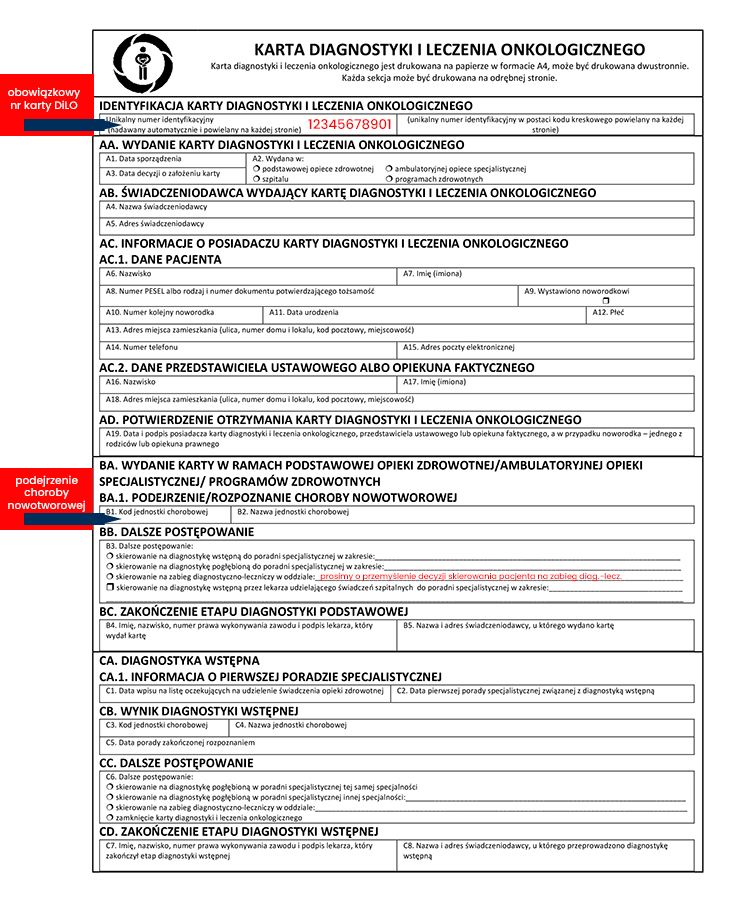 Pierwsza strona karty DiLO z zaznaczeniem miejsc, na które należy zwrócić szczególną uwagęplik pdf do pobrania