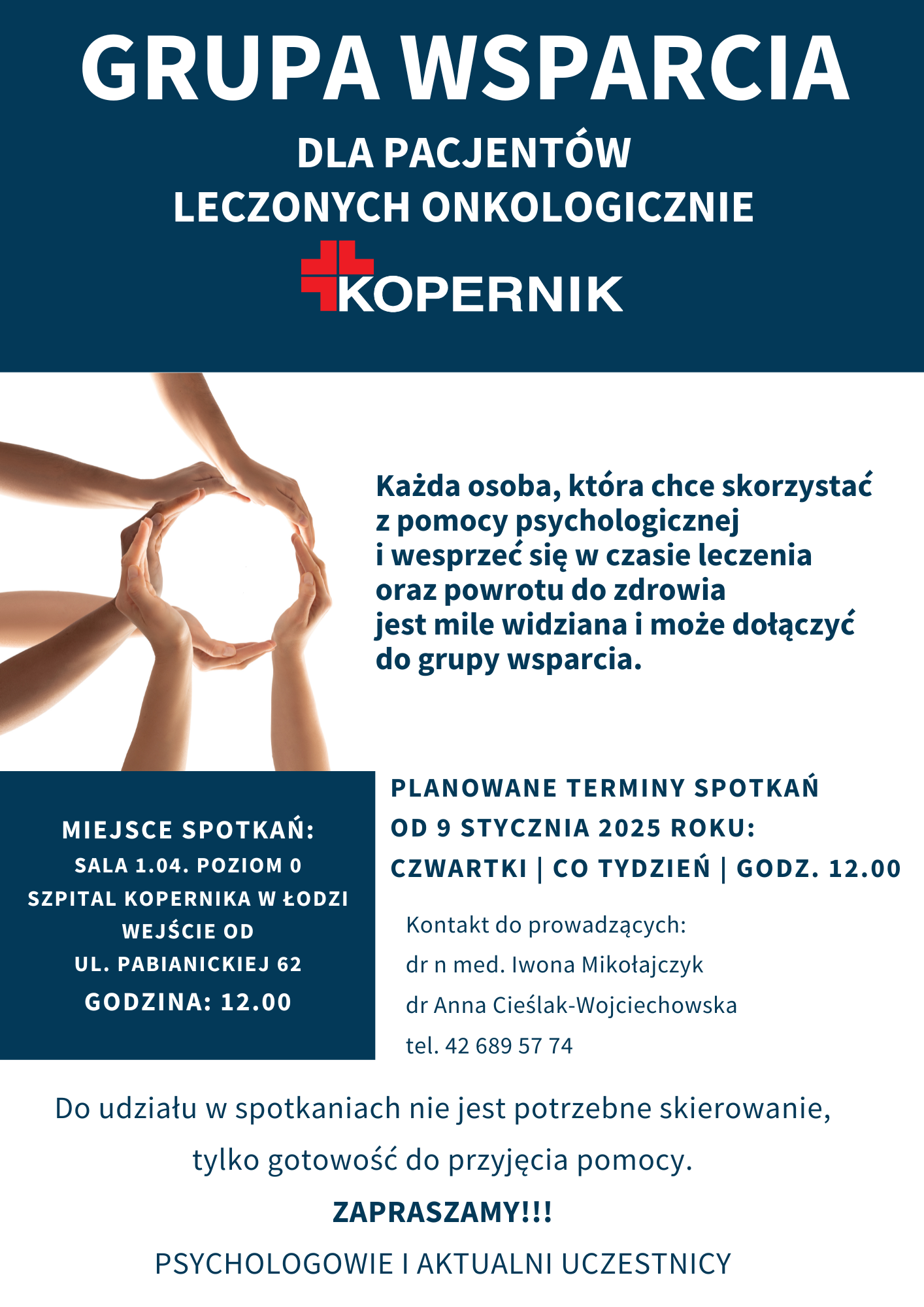 Zespół Psychologów pracujących w Szpitalu Kopernika w Łodzi udziela wsparcia i pomocy psychologicznej wszystkim potrzebującym Pacjentom (hospitalizowanym i leczonym w naszych przychodniach).