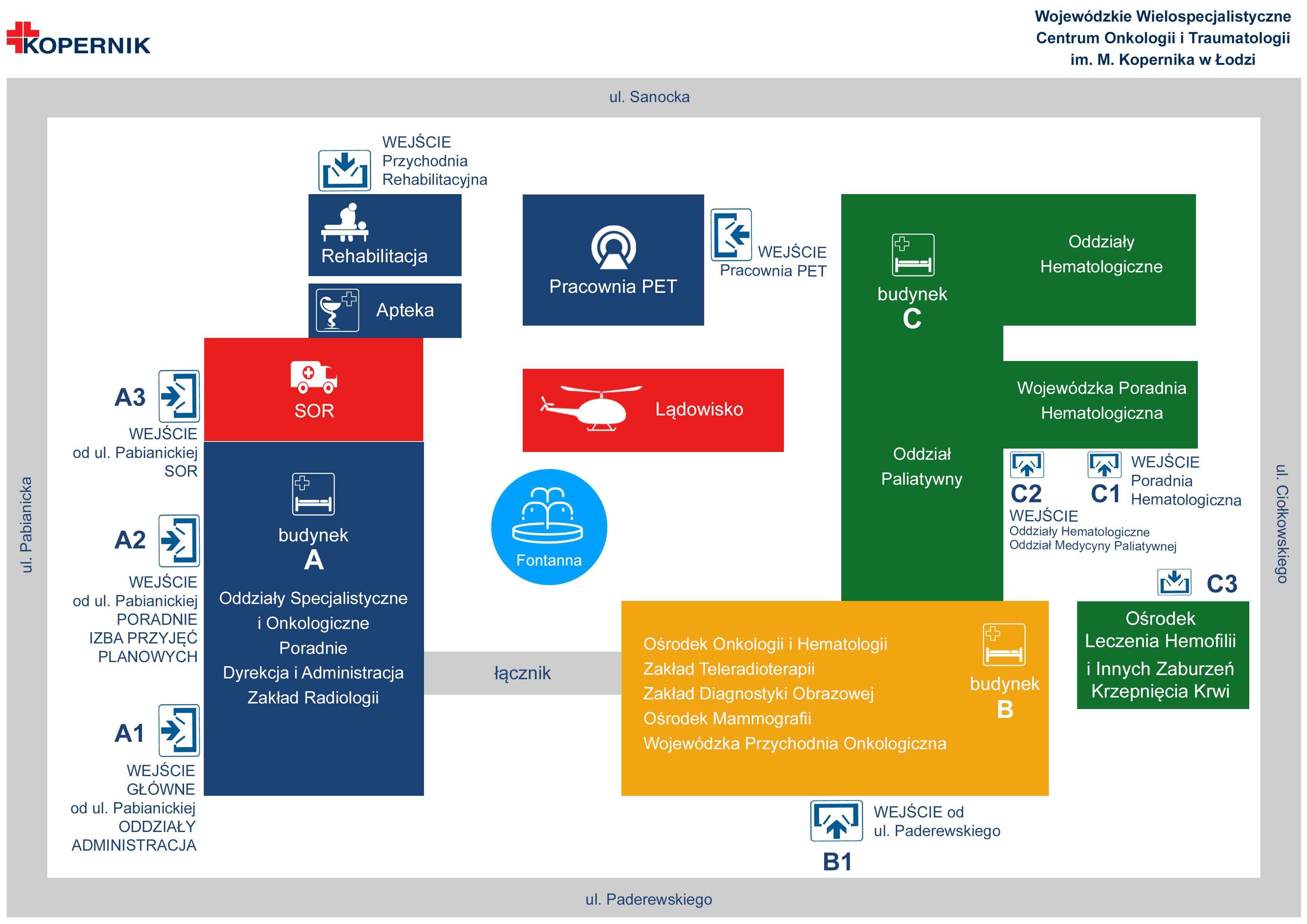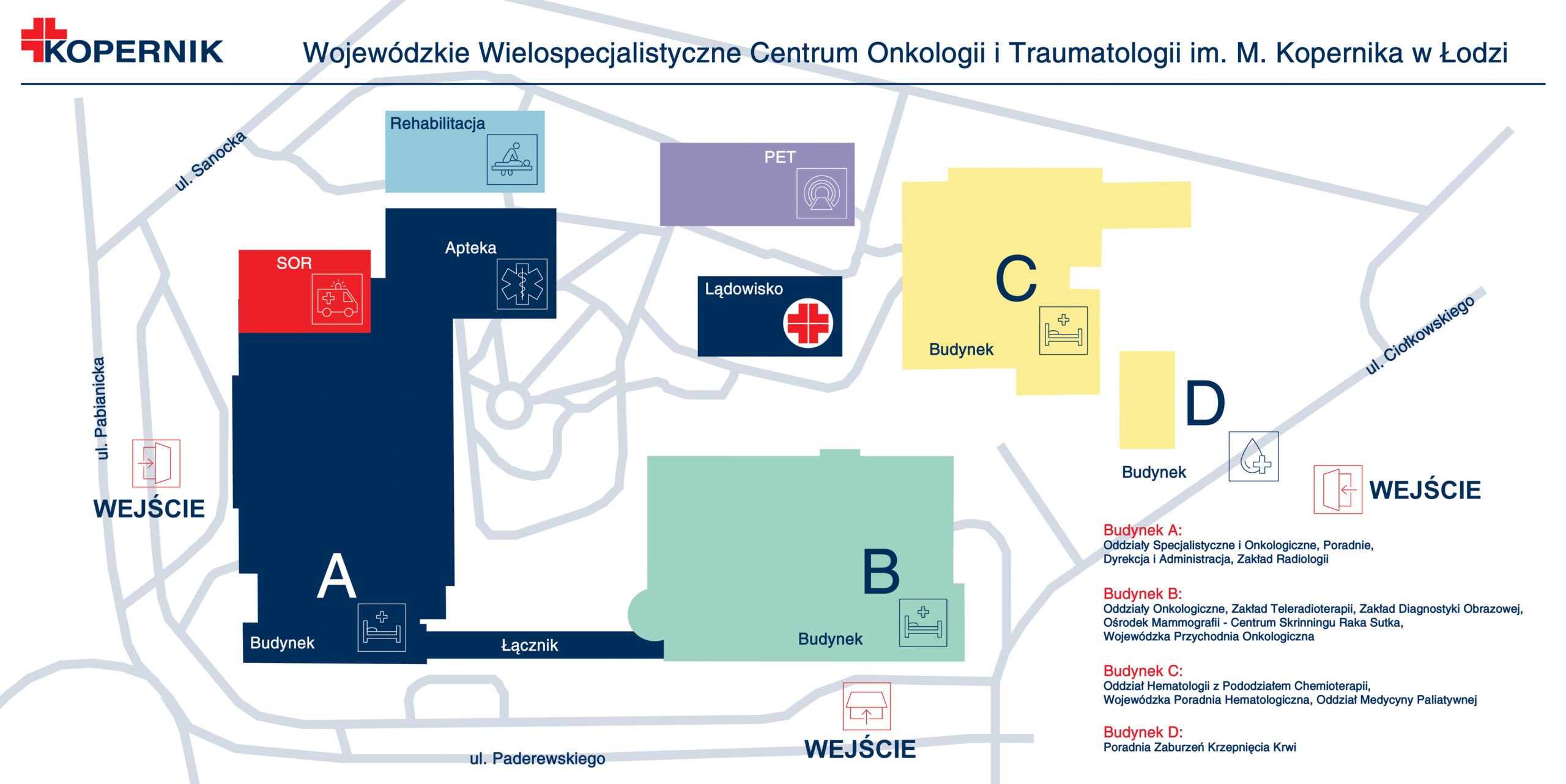 Wejście główne od ul. Pabianickiej 62. Wejście od ul. Paderewskiego 4 (część onkologiczna) oraz od ul. Ciołkowskiego 2 (część hematologiczna).