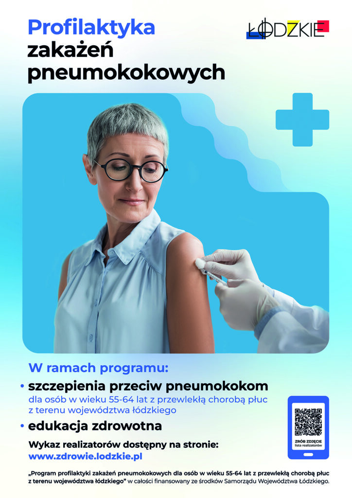 Zachęcamy do wzięcia udziału w „Programie profilaktyki zakażeń pneumokokowych dla osób w wieku 55-64 lat z przewlekłą chorobą płuc z terenu województwa łódzkiego”. Program m.in. obejmuje przeprowadzenie szczepienia przeciwko pneumokokom wraz z edukacją zdrowotną i jest w całości finansowany ze środków Samorządu Województwa Łódzkiego.