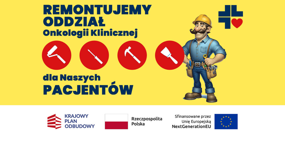 Szanowni Pacjenci! Dzięki dofinansowaniu z Krajowego Planu Odbudowy i Zwiększania Odporności (KPO) od 1 września 2025 rozpocznie się remont Oddziału Onkologii Klinicznej. Dzięki tej modernizacji będziemy mogli zapewnić naszym Pacjentom lepszą jakość świadczeń oraz wyższy komfort hospitalizacji.